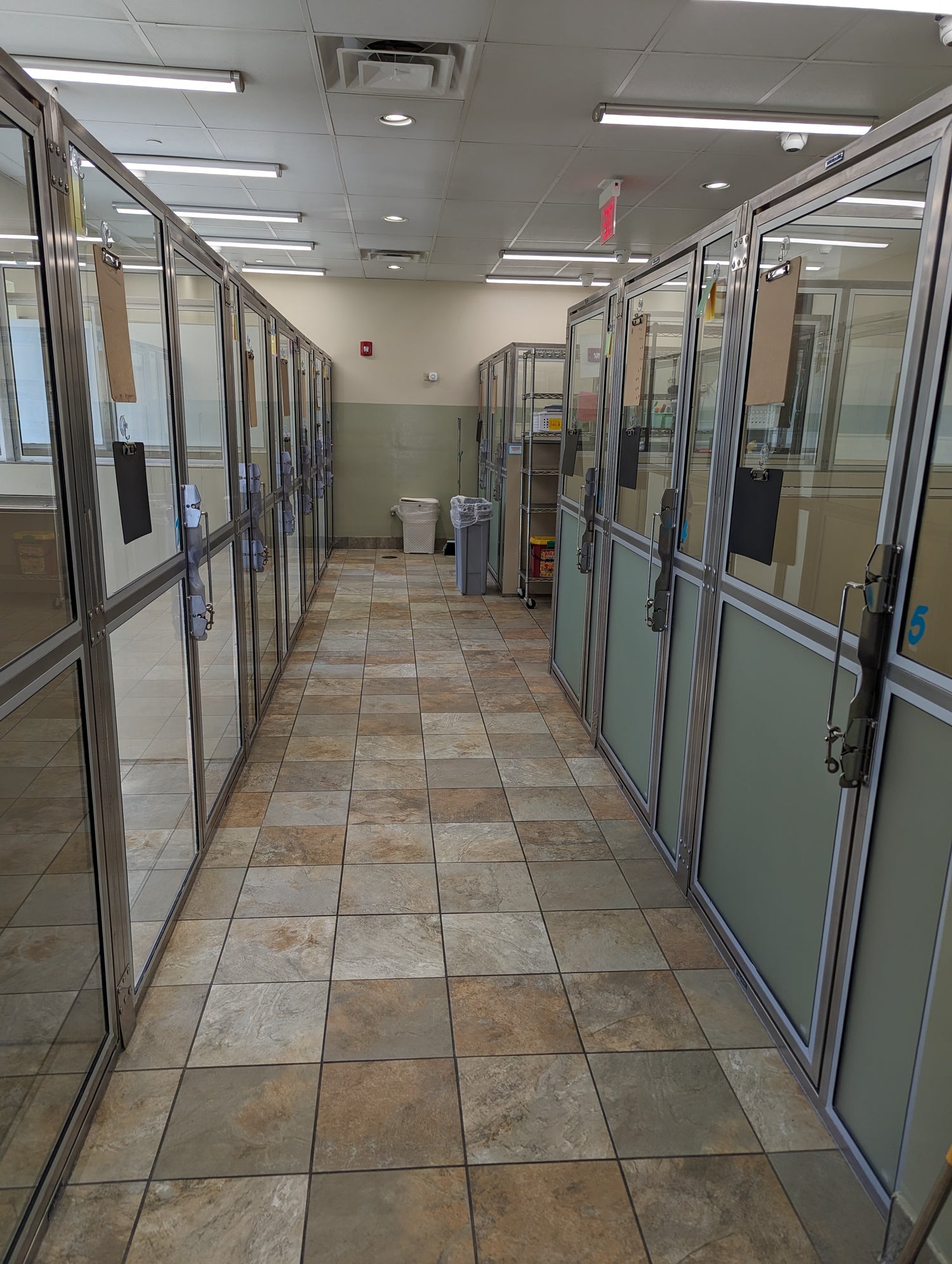 Half of the kennel aisle doors are designed with frosted glass, effectively preventing the dogs from seeing each other which reduces stress and tension.