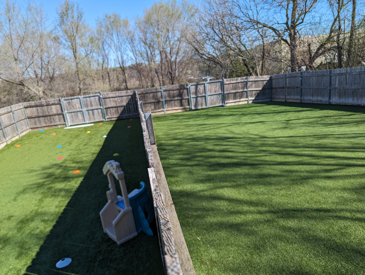 Our outdoor training space is laid with artificial turf, creating a smooth, safe, and mud-free surface for both play and training activities. A solid wooden fence surrounds the space, heightening safety and reducing any potential distractions during training. The area is also equipped with a drainage system ensuring that any rain, debris or urine will properly drain.
